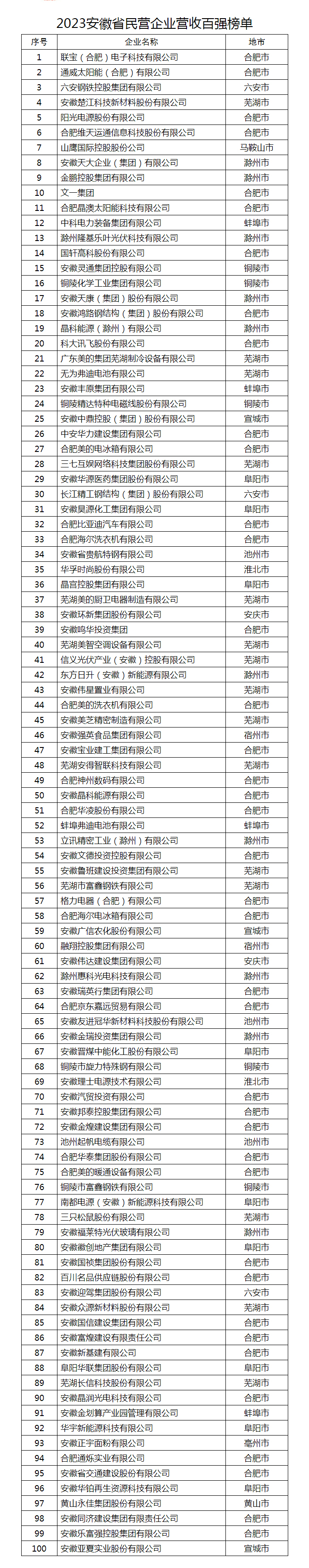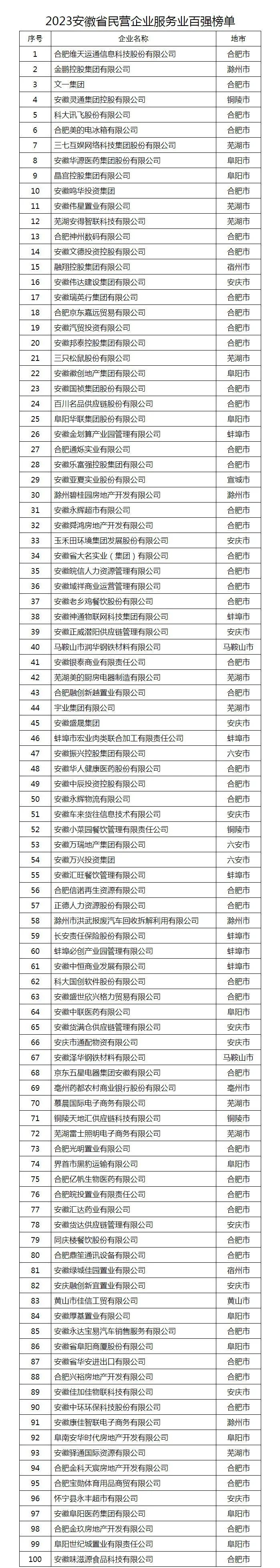 据悉,安徽省上规模民营企业调研及排序活动已连续开展25年。今年4月以来,安徽省工商联、省经信厅、省市场监管局联合开展“2022年度安徽省上规模民营企业调研及百强排序活动”。按照自愿参与原则,依据企业2022年度主要指标,经过审核、评议等环节,确定了2023安徽省民营企业百强、制造业综合百强和服务业百强榜单。
