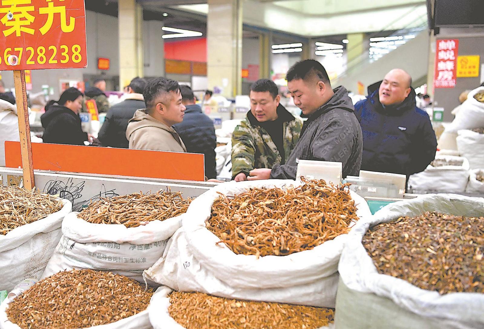 1月2日,药商在亳州中药材专业市场内选购中药材。新年伊始,亳州中药材专业市场内药商云集,交易繁忙。亳州市现有中药材种植品种410多个,常年种植面积120万亩以上。通讯员 刘勤利 摄