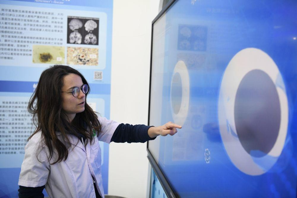 1月23日,法国留学生在安徽医科大学人体科学馆体验智能化交互学习平台。新华社记者 张端 摄