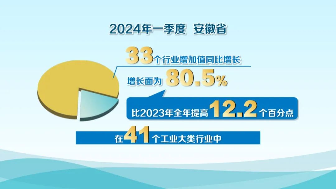 今年以来,安徽坚定不移推进制造强省建设,加快新型工业化,扎实开展工业稳增长“五大行动”,工业经济开局良好。一季度,全省规模以上工业增加值同比增长7.6%,比全国高1.5个百分点;在41个工业大类行业中,有33个行业增加值同比增长,增长面为80.5%,比2023年全年提高12.2个百分点。