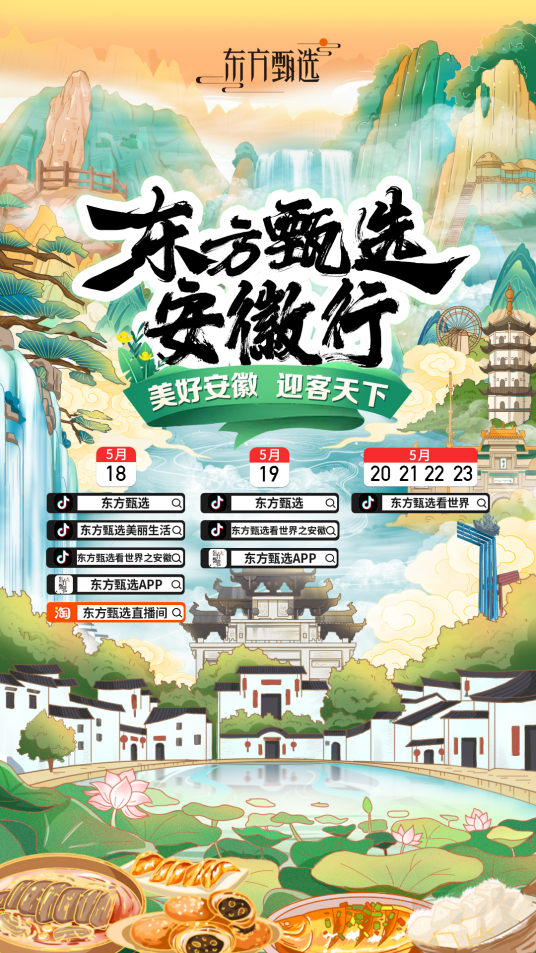 东方甄选安徽专场,将在5月18日至19日进行2日带货直播,通过东方甄选App、抖音、淘宝共计5个直播间,为全国网友力荐安徽。本次直播场地,特意选在风景如画的西递古村落,带领全国网友沉浸体验青山绿水、白墙黛瓦的徽派风情。