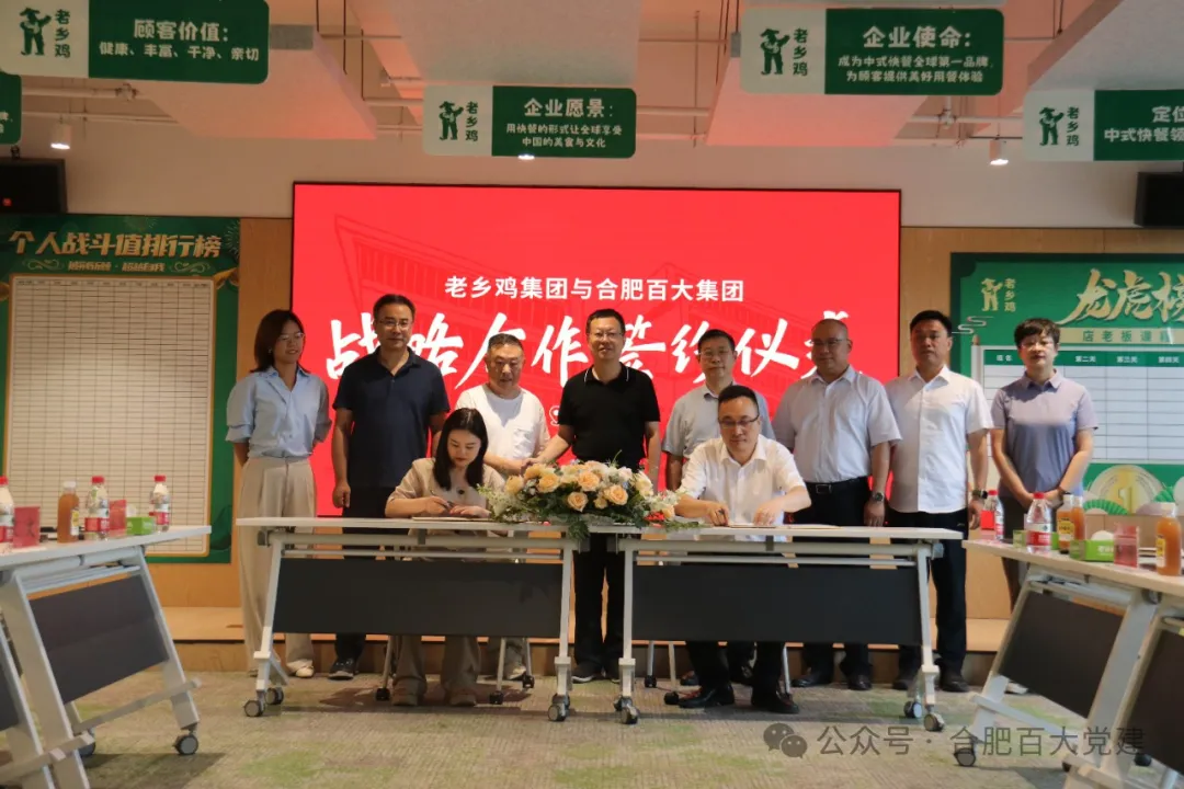 7月28日,合肥百大集团与安徽老乡鸡餐饮公司举行战略合作签约仪式。合肥市国资委党委书记、主任李宏卓出席会议并见证。百大集团党委委员、副总经理余綯、安徽老乡鸡餐饮公司副总经理束文代表双方签约。安徽老乡鸡餐饮公司创始人束从轩、百大集团党委书记、董事长沈校根、合肥乡投公司总经理绳纬、百大集团副总经理许杨共同见证签约。