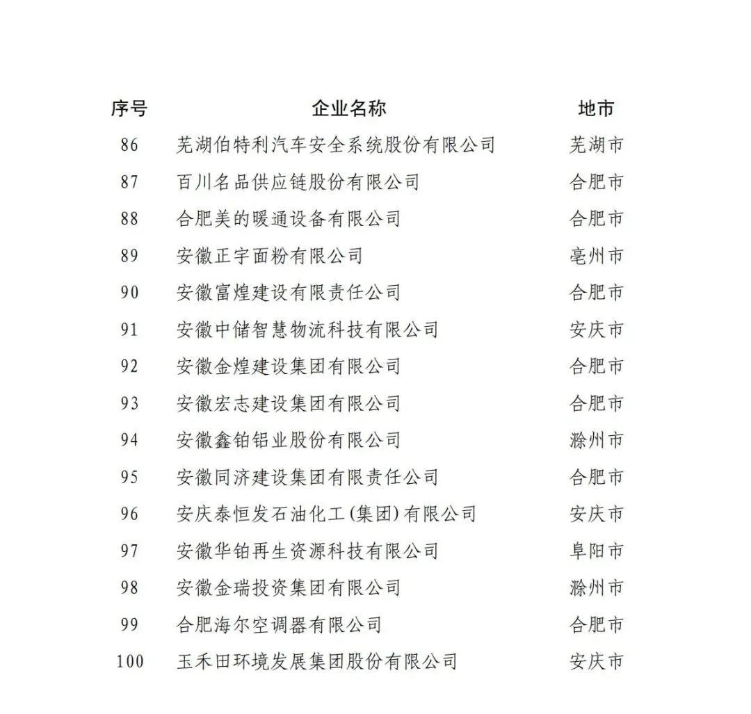 11月29日上午,2024安徽省民营企业百强发布会在合肥举行。安徽省工商联、安徽省工信厅、安徽省市场监管局公布2024安徽省民营企业营收百强、制造业百强和服务业百强榜单。