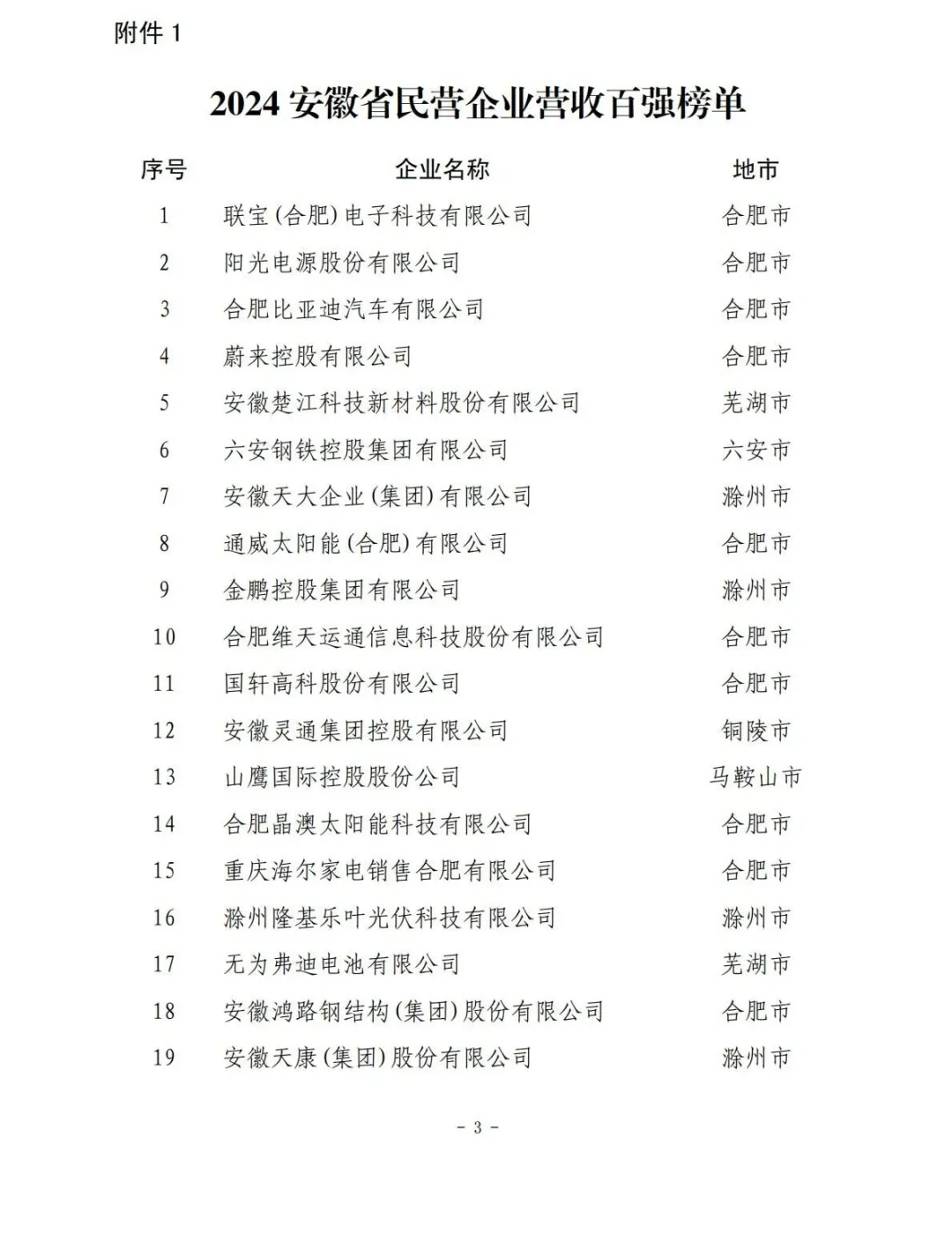 联宝(合肥)电子科技有限公司、阳光电源股份有限公司、合肥比亚迪汽车有限公司、蔚来控股有限公司、安徽楚江科技新材料股份有限公司位列安徽民营企业营收百强前五。