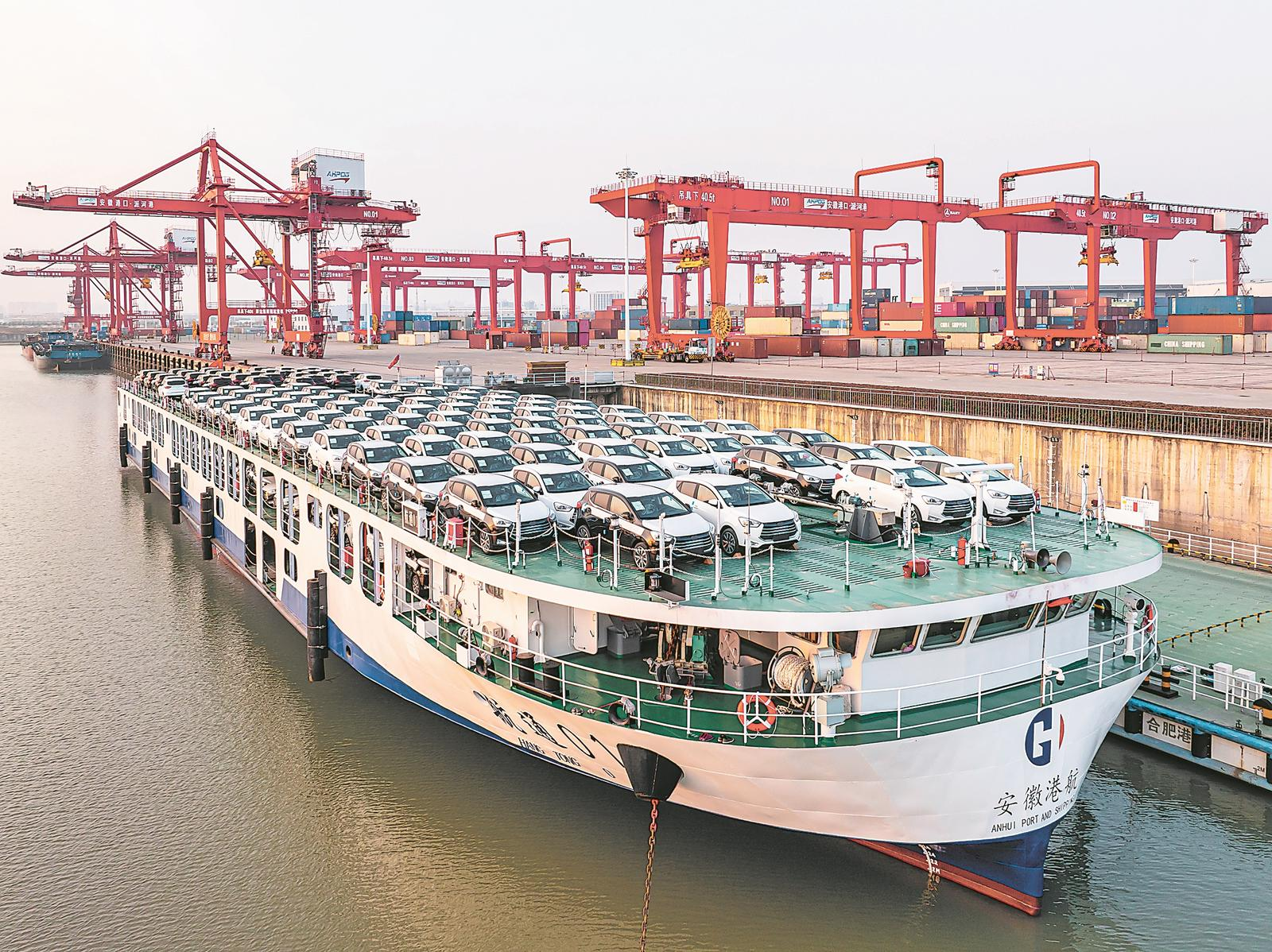 2月27日航拍的“航通01”汽车滚装船停泊在派河港码头,船上满载着皖产汽车,准备驶向上海。作为江淮运河上的首座集装箱码头,合肥派河港是服务皖货皖运、皖车出海的重要节点。
