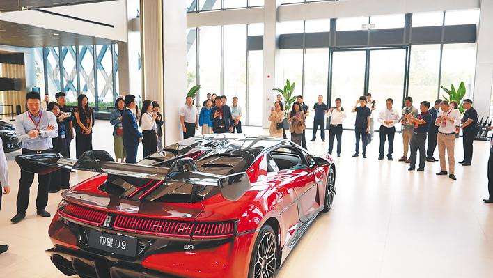 在比亚迪合肥赛车场的展厅,各种款式的新能源汽车让丹尼斯·蔡等来访的嘉宾目不暇接。其中,位于入口处的一辆红色新能源跑车——仰望U9尤其醒目,凭借其炫酷的原地弹跳和“跳舞”功能,成为全场的焦点。