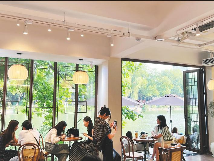 周末午后,合肥包公园浮庄内的“玄瀑茶咖”一座难求。临窗观景位早已满座,顾客们手捧热门新品“布蕾红茶拿铁”,将目光与镜头投向窗外的美景。