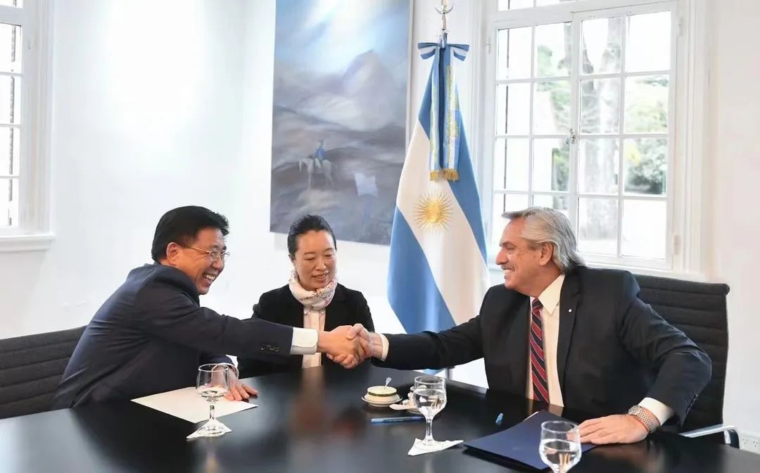 阿根廷总统阿尔贝托·费尔南德斯(Alberto Fernández)(右)与国轩高科董事长李缜(左)愉快交流